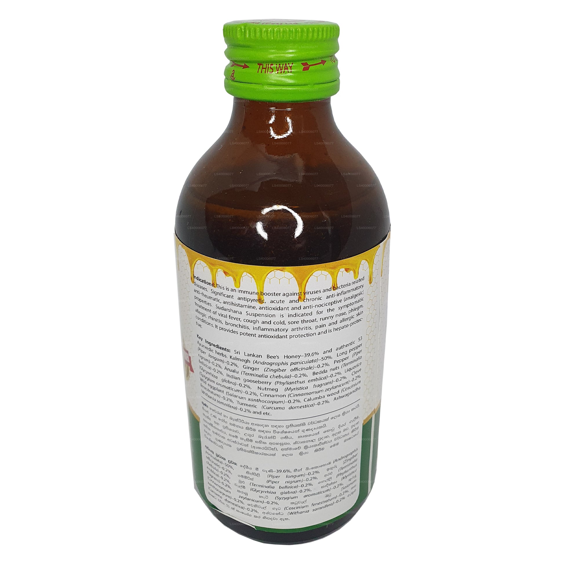 Sudarshana Suspension is indicated for the symptomatic treatment of viral fever, cough and cold, sore throat, runny nose, phlegm, allergic rhinitis, bronchitis, inflammatory arthritis, pain and allergic skin conditions. It provides potent antioxidant protection and is hepato-protective. this is an immune booster against viruses and bacteria related diseases.