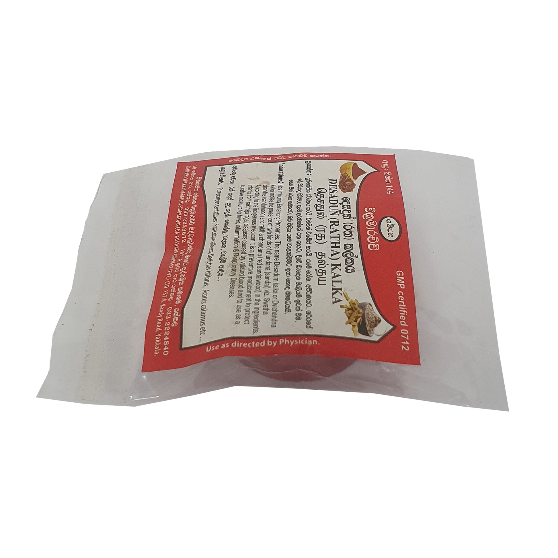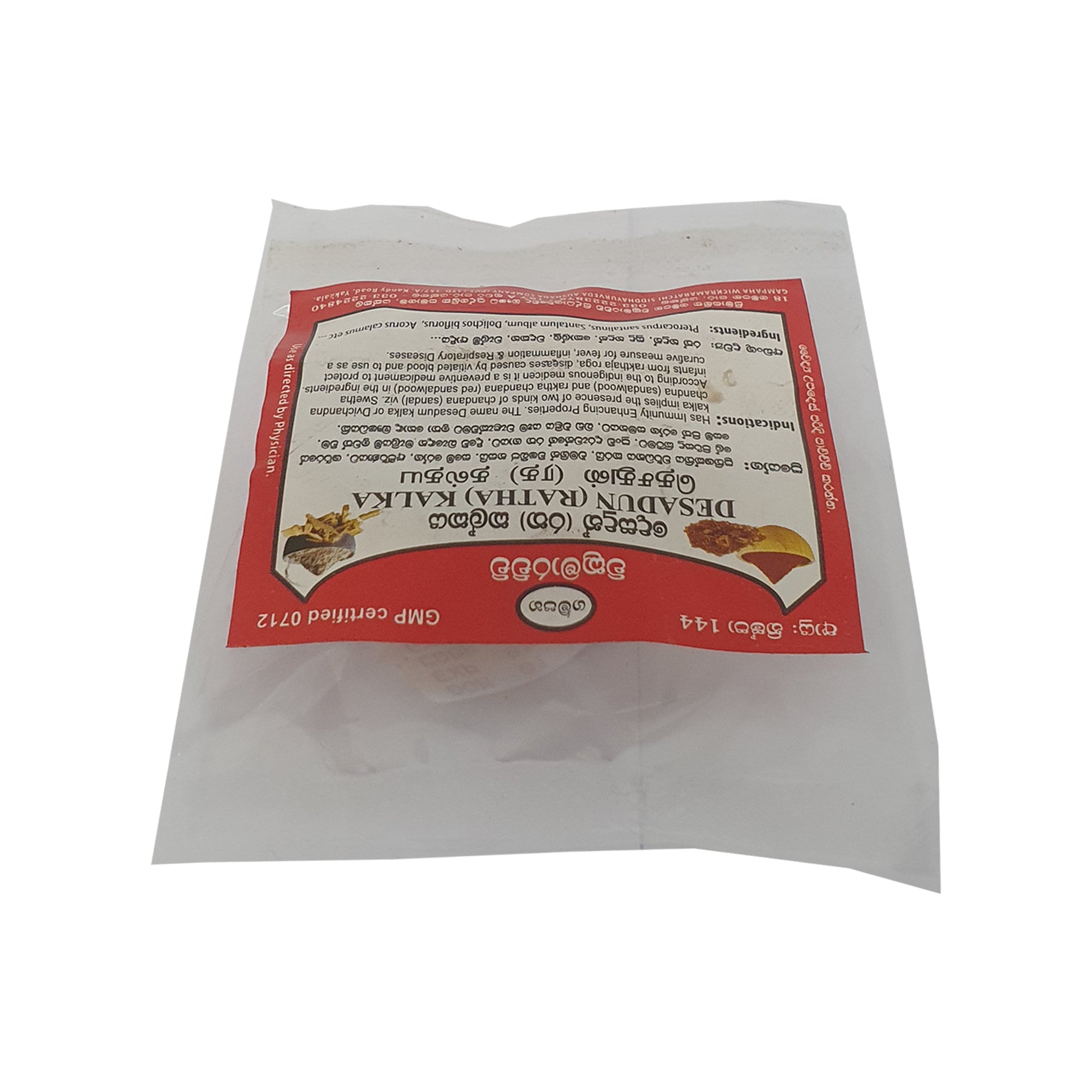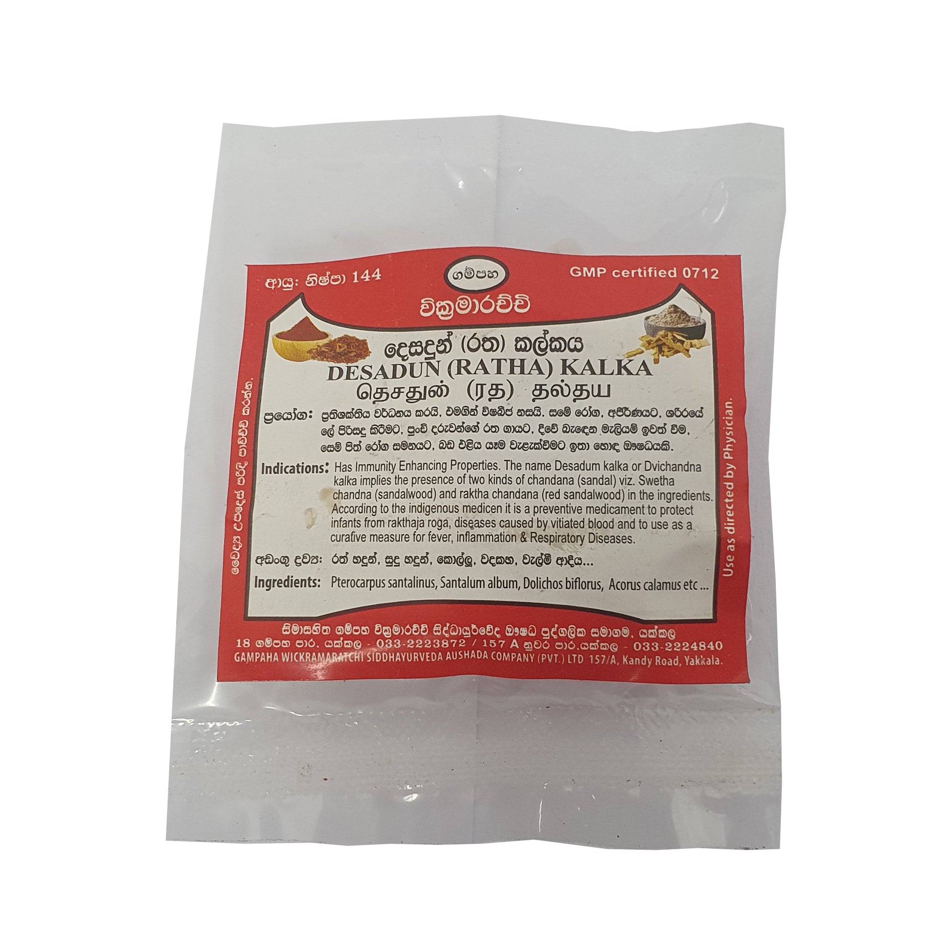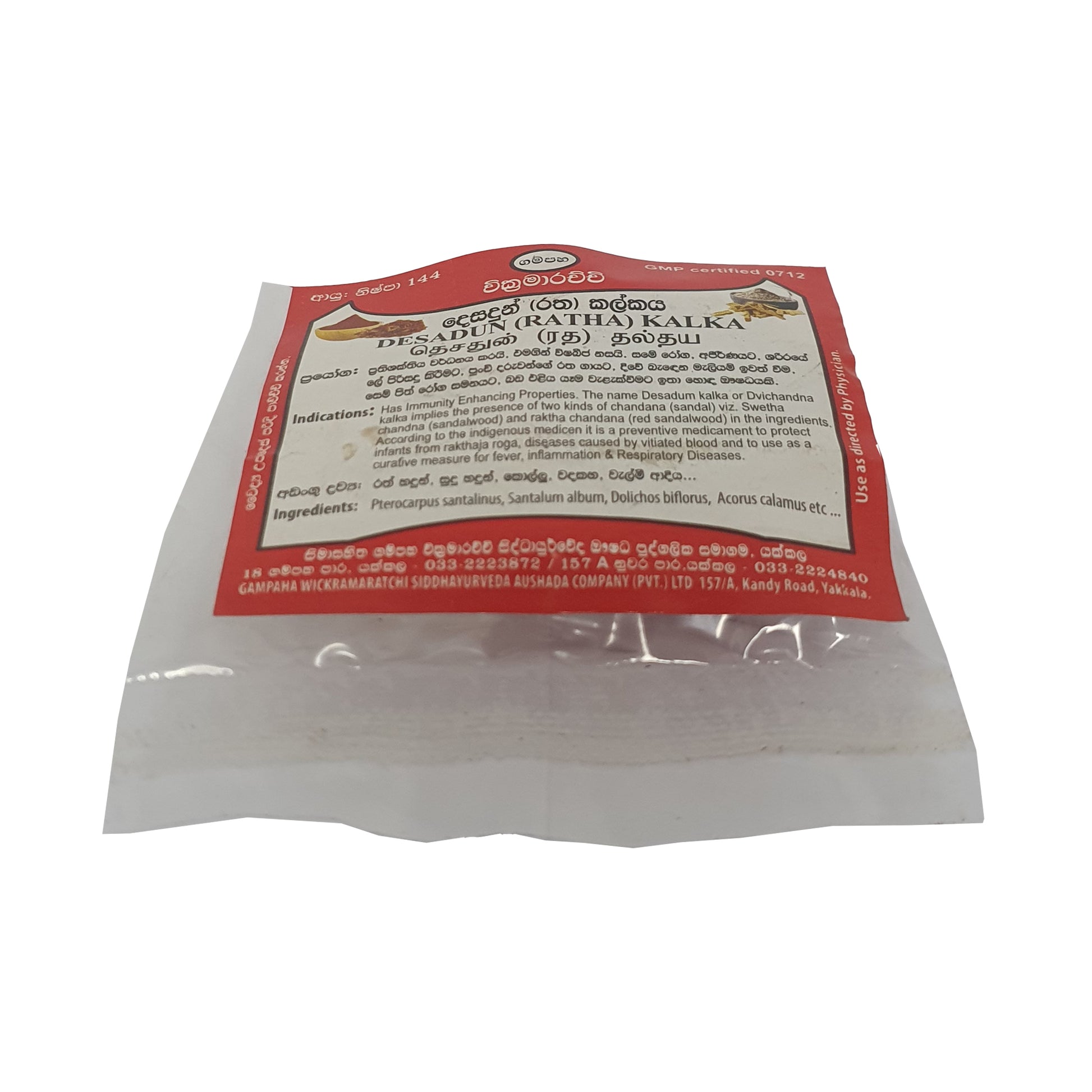 गम्पाहा विक्रमराच्ची देसदुन कालका (रथा कालका) सफेद और लाल चंदन वाला एक पारंपरिक दवा का मिश्रण है, जो इम्यूनिटी बढ़ाने के लिए जाना जाता है। इसका इस्तेमाल देसी दवा में मुख्य रूप से बच्चों में खून से जुड़ी बीमारियों को रोकने और लिवर की समस्याओं, सूजन और सांस की बीमारियों के इलाज के लिए किया जाता है। यह दोहरे मकसद वाला उपाय पारंपरिक स्वास्थ्य तरीकों में अपने प्राकृतिक, असरदार इलाज के तरीकों के लिए जाना जाता है।