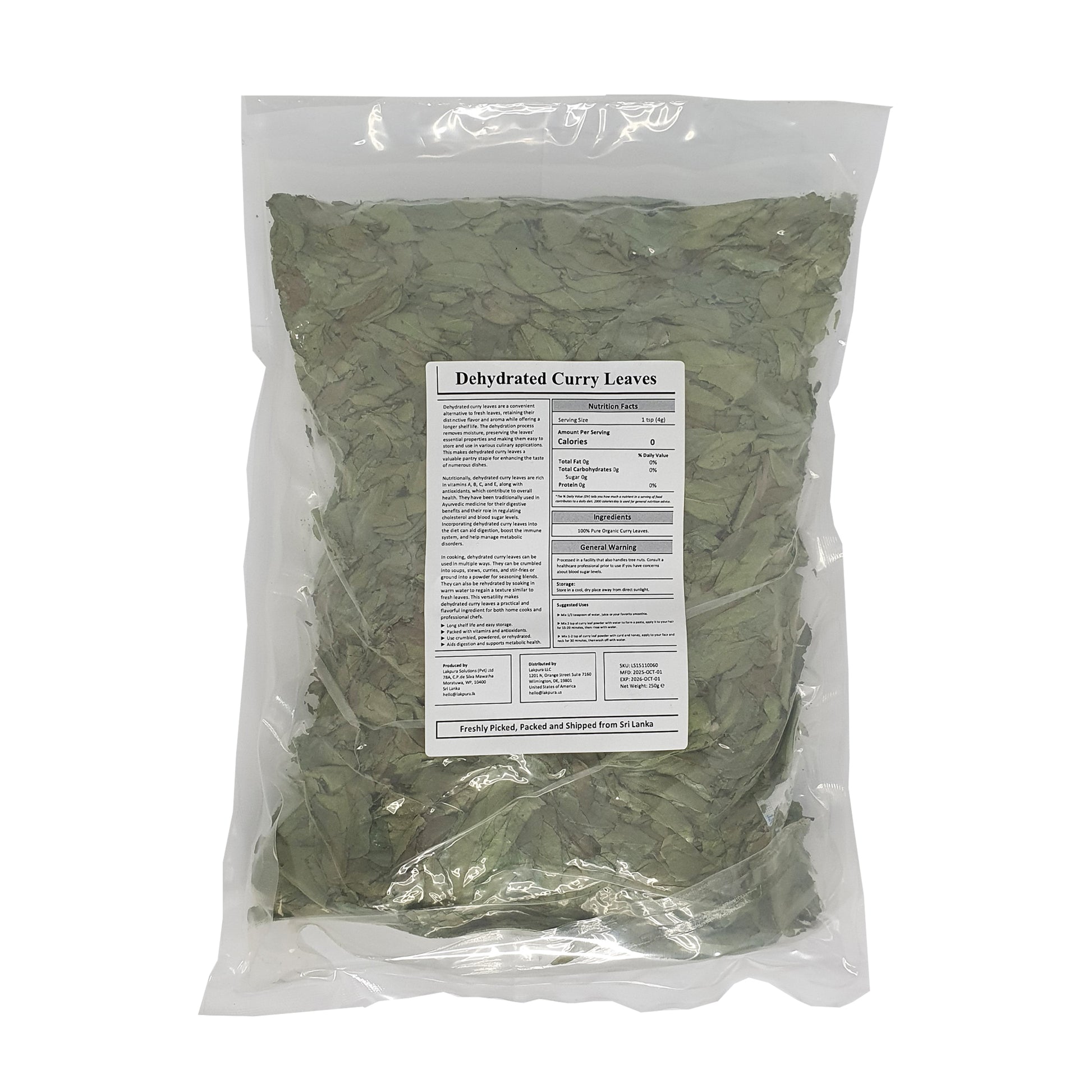 Lakpura® Curry Leaves मुख्य रूप से घरेलू बागों और छोटे खेतों से इकट्ठी की जाती हैं, जबकि इन्हें सख्त स्वच्छ परिस्थितियों में छांटा और सुखाया जाता है, जो यह सुनिश्चित करता है कि पत्तियों के पोषक तत्व और सुगंधित गुण नहीं खोते हैं। करी पत्तियां सूखी जाती हैं ताकि उनकी पोषक विशेषताओं को नुकसान पहुंचाए बिना लंबी शेल्फ लाइफ प्रदान की जा सके। ये करी, चटनी, स्टिर-फ्राई और यहां तक कि सूप में उपयोग किए जाने पर एक अद्वितीय मिट्टी जैसी नींबू जैसी खुशबू देती हैं।