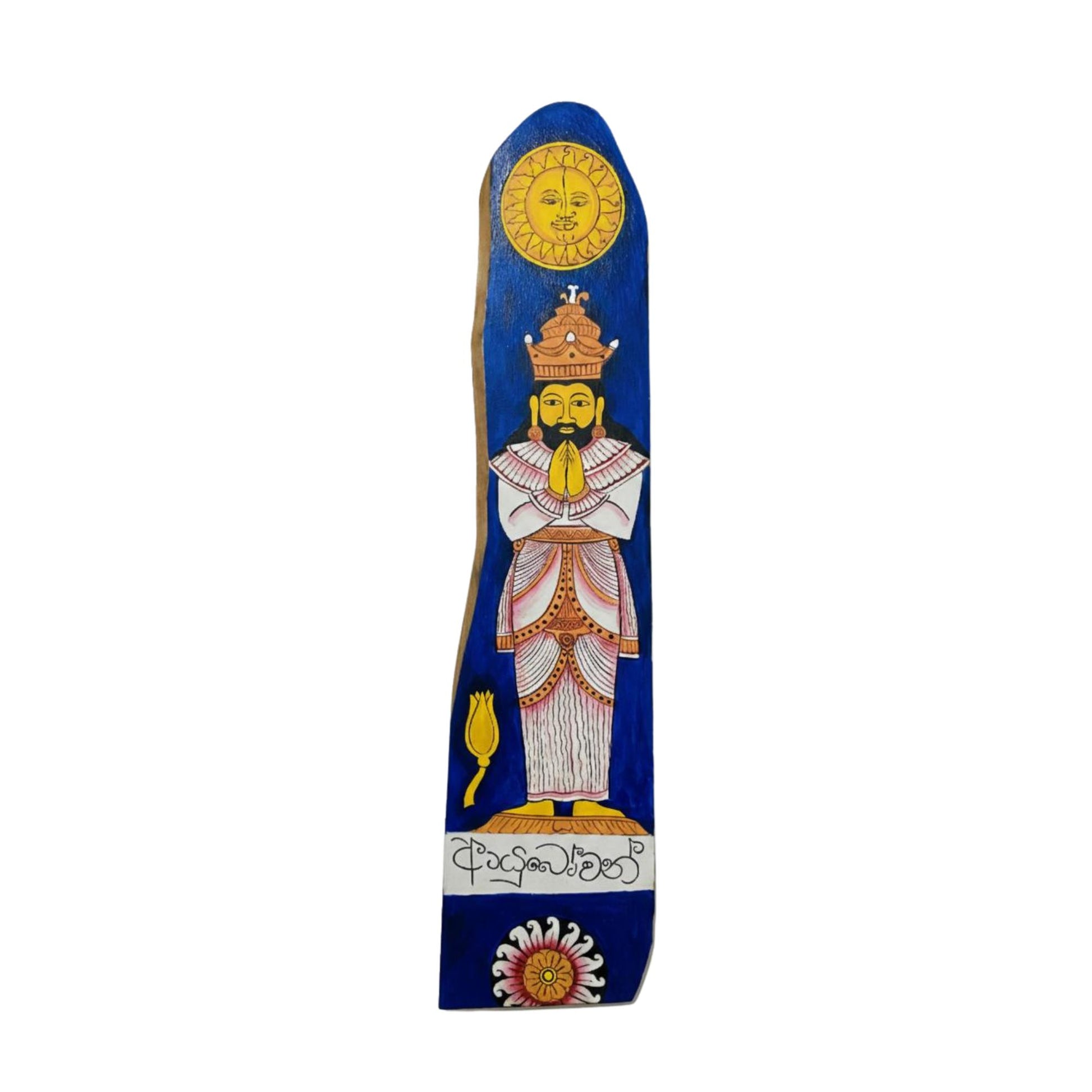 Lakpura® Wall Art “Ayubowan” Design (L) is a beautifully hand-painted wooden panel inspired by the Kandyan Kingdom era. Featuring the traditional Ayubowan greeting with the Kandyan King, along with the sun and moon symbols representing eternity and prosperity, this artwork reflects Sri Lanka’s rich cultural heritage. Painted with high-quality acrylic colors on wood, it offers lasting beauty and vibrant detail. Ideal for entrances, living spaces, or reception areas, this panel adds a warm, respectful, and traditional welcome to any setting.