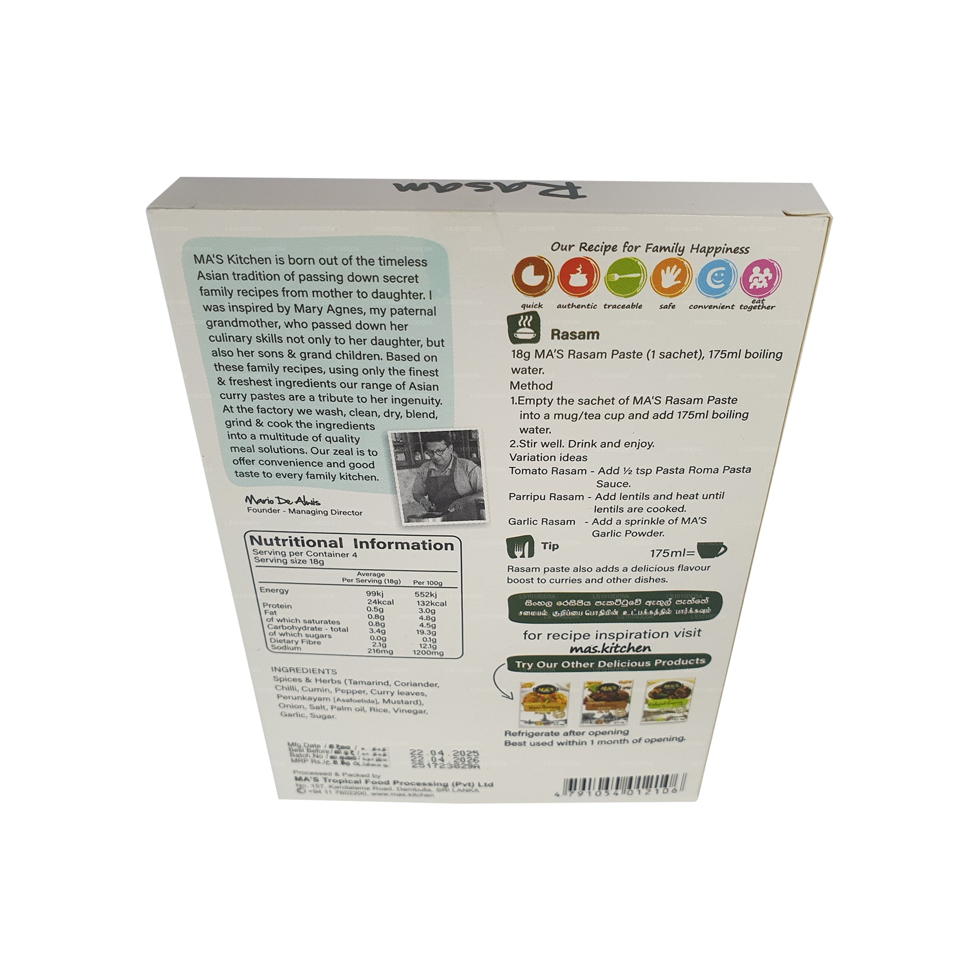 MA's Kitchen Rasam Paste (72g) offers an authentic taste of South India's classic Rasam in a convenient form. This expertly blended paste combines premium spices and natural ingredients for a tangy and aromatic experience. Versatile and time-saving, it's perfect for Rasam and other dishes. Free from artificial additives, it lets you savor the true essence of South Indian flavors. Elevate your meals with MA's Kitchen Rasam Paste and enjoy the richness of South Indian culinary heritage.